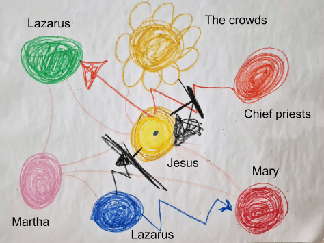 I invite you to watch the reading of the Gospel from John 12:1-11, which starts at about 14 minutes into the service. And the sermon starts at about 22 minutes and runs for about 23 minutes. This is a visual sermon, mapped out on a flipchart, so you really do need to watch it and not just listen to it. May you place yourself in the centre of Christ, in his light and peace – the best place to be!